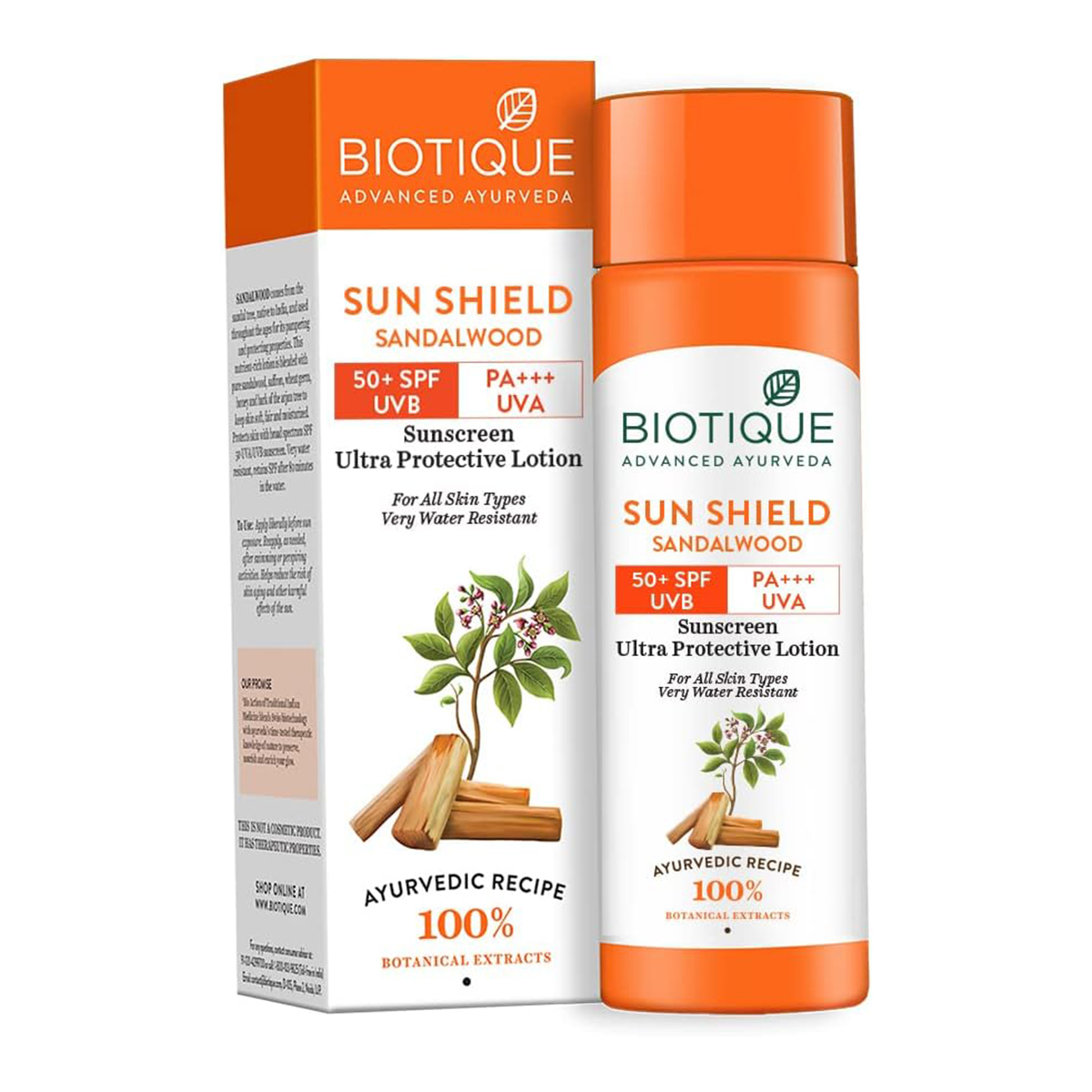 sunscreen. Very water resistant, retains SPF after 80 minutes in the water.Biotique Sun Shield Sandalwood 50+SPF UVB Sunscreen Ultra Protective Lotion provides ultimate sun protection while keeping your skin healthy and moisturized. With a blend of pure sandalwood, honey, and saffron, this Biotique sunscreen is formulated to protect the skin from sunburn and sun damage, preventing premature ageing.