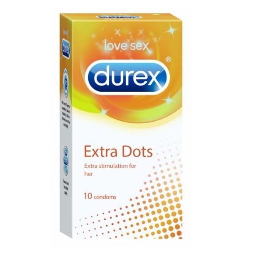 Durex Extra Dot Condom - 10Pcs Pack Size: 10pcs Dotted condoms for added stimulation Straight walled condoms that smell good Transparent & lubricated natural rubber latex condoms 100% electronically tested Complies to ISO 4074 Standards Length: 180 ± 2 mm; Width: 53 ± 2 mm Global Store