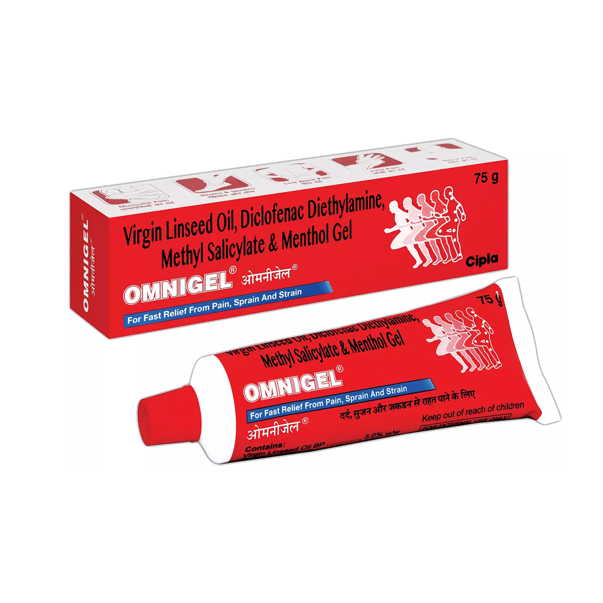 OmniGel is a combination of Diclofenac, Methyl salicylate, Menthol and Linseed oil. It is a painkiller used to relieve joint pain associated with arthritis (swelling, tenderness and pain of one or more joints). It is also used to relieve the pain caused by muscles injuries such as sprain or strain.