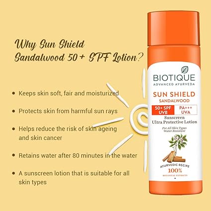sunscreen. Very water resistant, retains SPF after 80 minutes in the water.Biotique Sun Shield Sandalwood 50+SPF UVB Sunscreen Ultra Protective Lotion provides ultimate sun protection while keeping your skin healthy and moisturized. With a blend of pure sandalwood, honey, and saffron, this Biotique sunscreen is formulated to protect the skin from sunburn and sun damage, preventing premature ageing.
