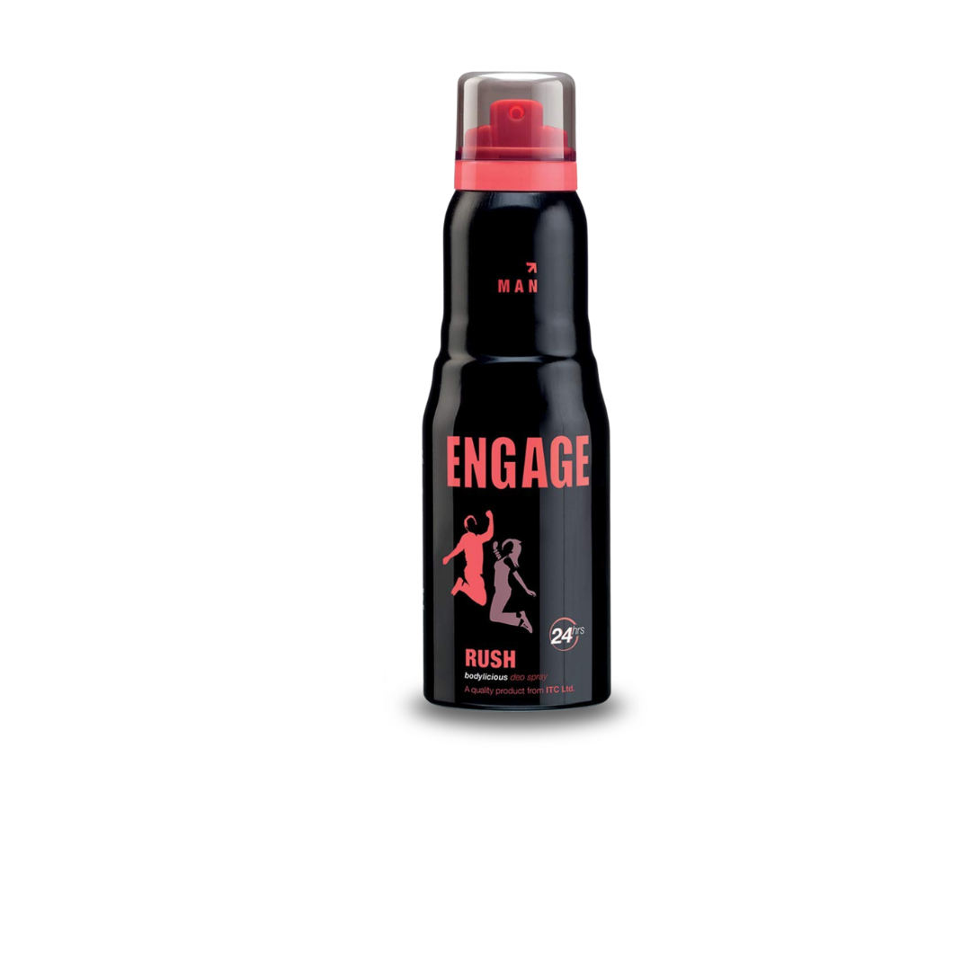 Long lasting fragrance that keeps you fresh all day | Quality Product assured by Laboratoire Naturel (Innovations in Skin Care) | Skin Friendly - Made with safe on skin ingredients | Usage: Shake the can, hold straight up approximately 15cm away from your body and spray on your underarms, neck and chest | Suitable for special occasions to make you feel warm and special | Trusted Product from ITCEngage Rush Deodorant For Men, Fruity and Sweet , Skin Friendly, 150 mlEngage man deo rush for men who have a bold, modern look and has been designed in classical black with a tinge of effervescent colours. It provides 24 hour freshness and has been crafted to enhance their personal grooming and confidence.