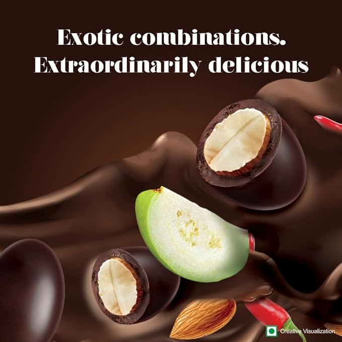 - A flavorful twist:An exquisitely crafted combination of smooth dark cocoa rich chocolate that wraps a crunchy roasted Californian Almond, sprinkled with flavor, for an experience that is dark outside, exotic inside.