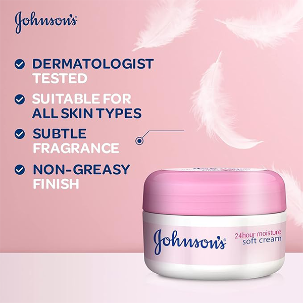 Apply JOHNSON'S 24-Hour Moisture Soft Cream over your whole body, massaging it into your skin. When applying to your face, use gentle circular motions on your cheeks and forehead and lightly tap closer to your eyes to stimulate blood circulation and beautifully firm and healthy complexion.