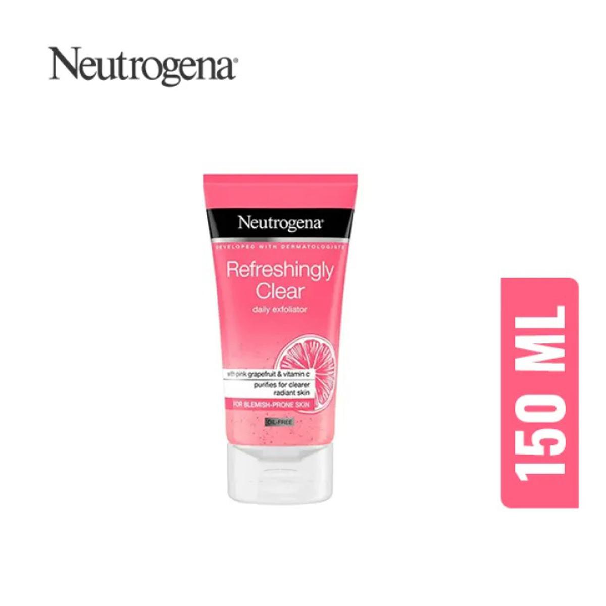 NEUTROGENA Refreshingly Clear Daily Exfoliator 150ml. This refreshing daily facial scrub contains pink grapefruit & vitamin C for a clearer radiant complexion. With natural exfoliators, that unclogs pores, the formula deeply cleanses to help prevent imperfections without overdrying skin. Discover the full NEUTROGENA Refreshingly Clear range.