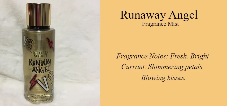 Victoria’s Secret Runway Angel Fragrance Mist is Angel Fresh Bright Currant Shimmering petals Blowing kiss. Our latest limited edition is inspired by the most unforgettable moments of the Victorias Secret Fashion Show. The perfect way to add a pop of fashion show to your fragrance wardrobe.